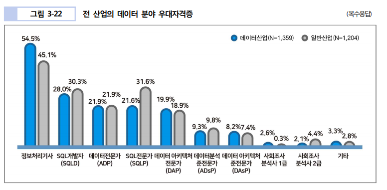 데이터 분석 관련 자격증은 어느 정도 영향을 미칠까? 앞서 언급한 자격증을 포함한 다양한 종류의 전문자격증이 있지만 우대비율은 그리 높지 않은 것으로 보인다. 특히 현업의 경험 없이 취득할 수 있는 데이터 분석 준전문가 자격증의 경우 데이터 산업과 일반산업 모두 10% 미만의 우대비율을 보인다.