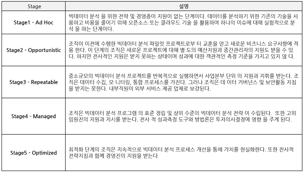 데이터 분석의 적용사례가 확장되는 현상을 보았을 때, 국내 기업들은 데이터 분석의 성숙도 모델의 3단계 또는 4단계에 진입하고 있는 것으로 보인다. 데이터 분석의 성숙도 모델은 미국의 컨설팅 기관인 IDC(International Data Corporation)에서 발표한 것으로서 애드혹(Ad Hoc)에서부터 최적화(Optimized)에 이르는 5가지 단계를 제시한다. 이 모델에서 말하는 3단계(Repeatable)와 4단계(Managed)는 조직에 받아들여진 데이터 분석이 반복 수행되고 프로세스가 자리 잡으며, 데이터 분석 프로그램의 표준이 정립되고 상위 수준의 데이터 분석 전략이 수립되는 수준을 의미한다. 이처럼 데이터 분석이 성숙하는 단계에서는 분석 역량을 갖춘 사람이 점점 더 많이 필요하다. 또한 데이터 분석을 전담으로 하는 직무가 아니더라도 본인이 속한 도메인에서 데이터 분석을 할 수 있어야 한다.
