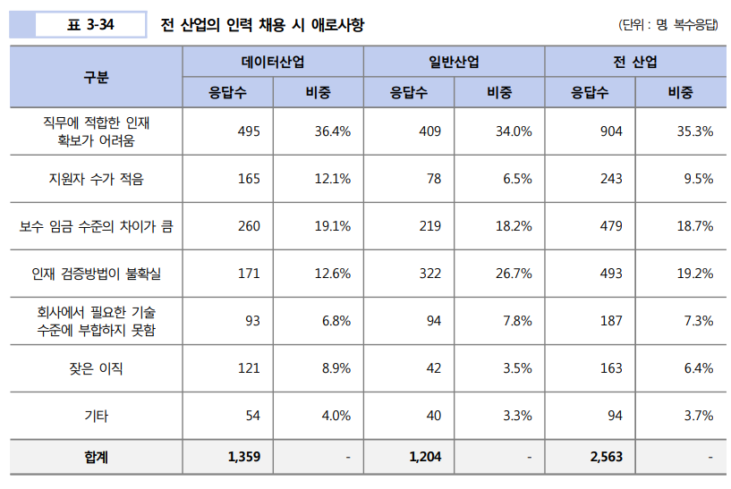 왜 그런 것일까? 해당 보고서에서는 데이터 직무 인재 채용 시 발생하는 애로사항으로 '직무에 적합한 인재 확보가 어렵다.'는 응답이 35.3%로 가장 높았으며, '인재 검증방법이 불확실하다.'는 응답이 19.2%였다(전 산업 기준, 응답수 2,563명). 이러한 자료를 종합해보면 교육프로그램과 자격증은 많으나 실제 직무에 필요한 역량을 갖춘 인재는 여전히 많지 않다는 결론을 낼 수 있다.